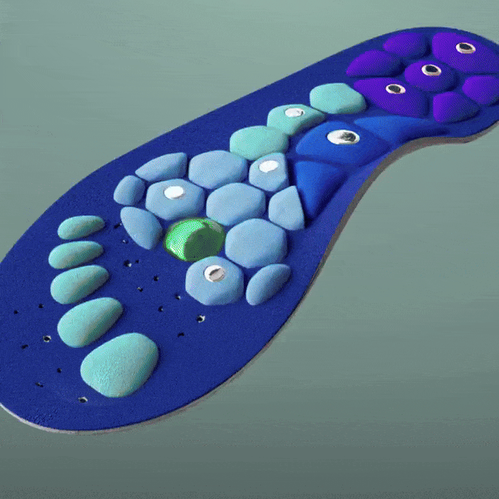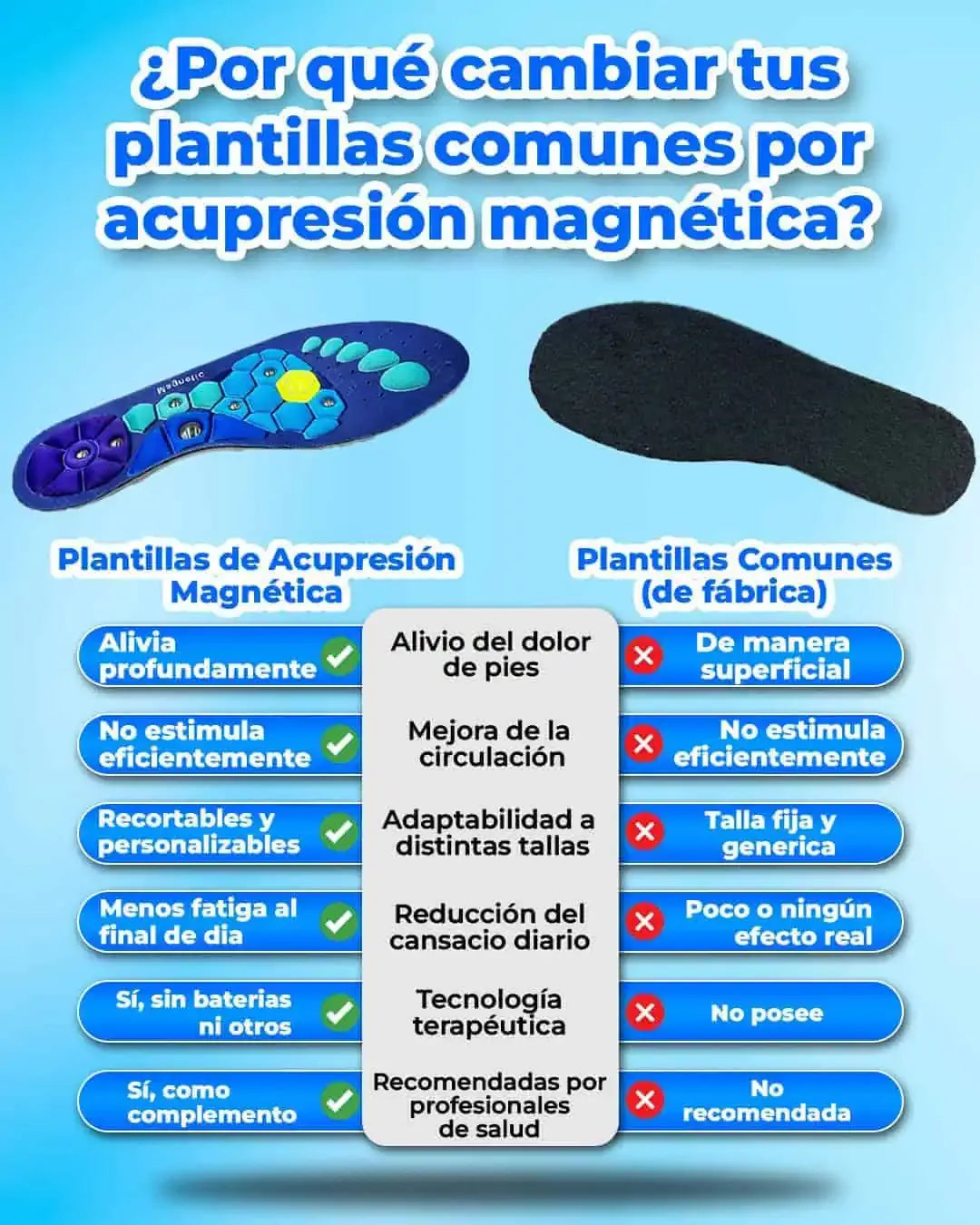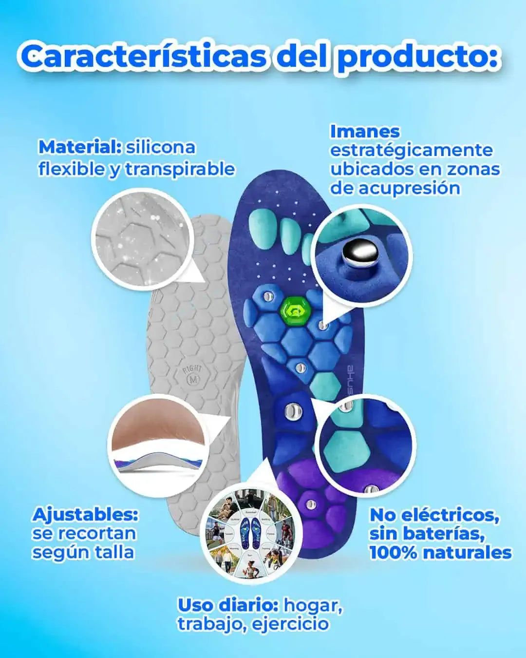 Las plantillas están diseñadas para acompañar el movimiento de tu pie. Los puntos de acupresión estimulan zonas cargadas, y la capa magnética añade una sensación relajante.