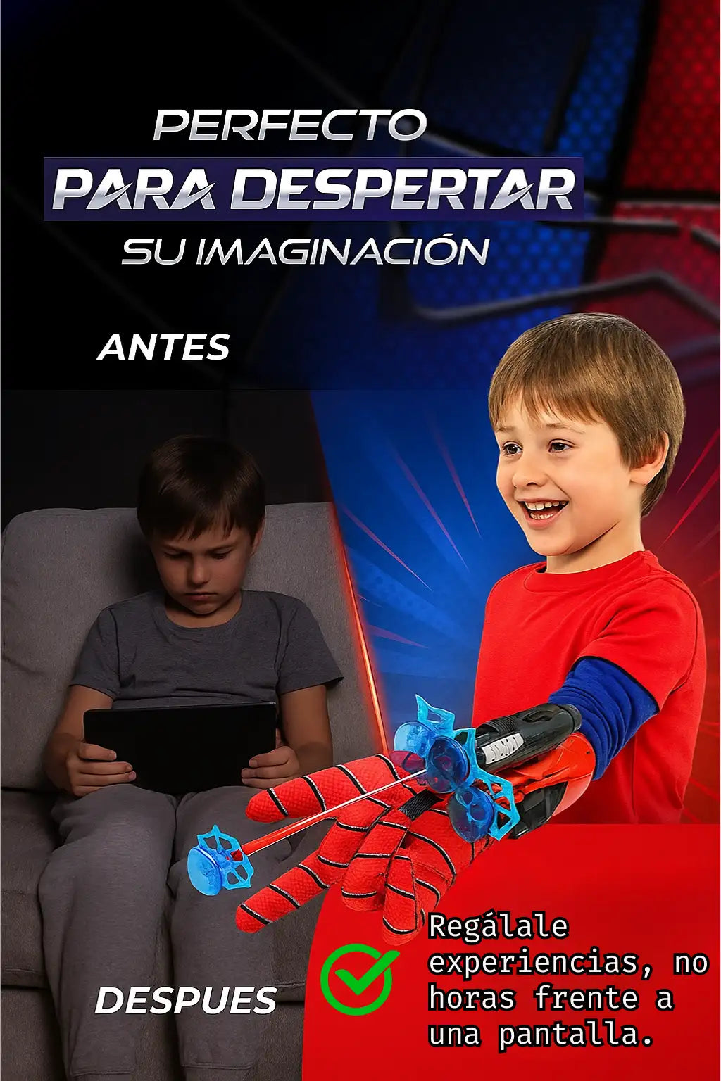 Con el Guante SpiderMan Lanza Aventuras vuelve a jugar, moverse, imaginar y ser niño otra vez, lleno de energía y felicidad.🦸♀️